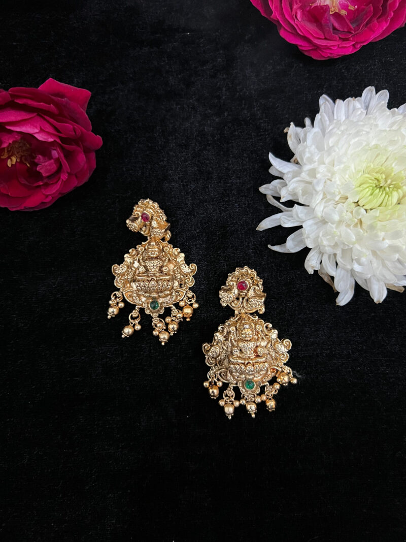 The long necklace is adorned with intricate carvings and temple-style embellishments, making it a stunning centerpiece for your ethnic attire. - Matching Earrings: